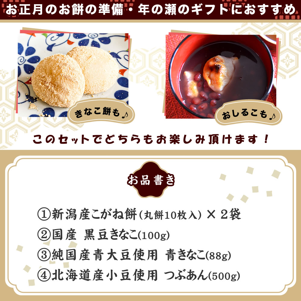 | セット内容 | 1.新潟産こがね餅丸餅シングルパック10枚(330g)x2袋 2.国産黒豆きなこ(100g)x1袋 3.純国産青大豆使用 青きなこ(88g)x1袋 4.北海道産小豆使用粒あんこ(500g)x1袋 |