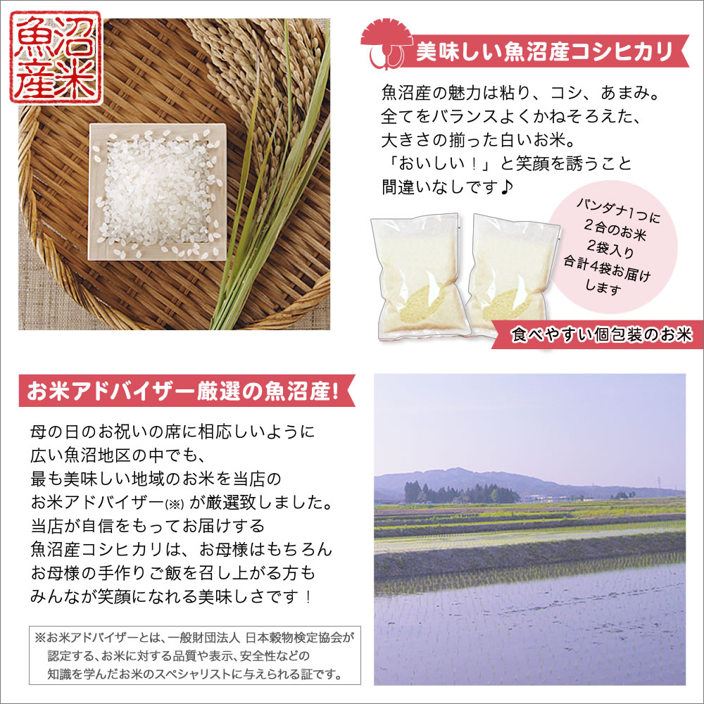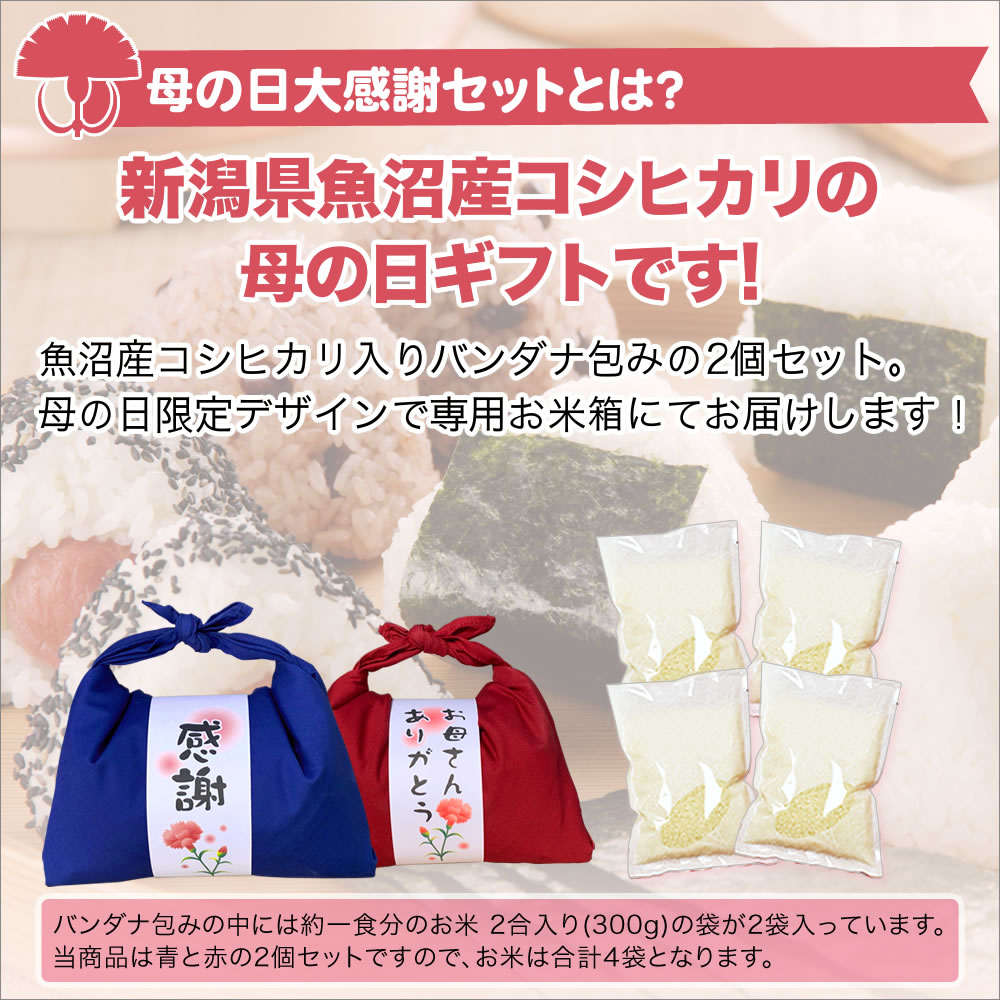 | 商品内容 | ●魚沼産こしひかり 300g×4袋 ●母の日特別デザイン バンダナ包み×2点(紅、蒼各1) ●バンダナ包み2個セット専用お米箱 ※納品書は同封致しません。 ※当商品は他商品との同梱不可です。 ※当商品は、メッセージカードは同梱対応しておりません。 |