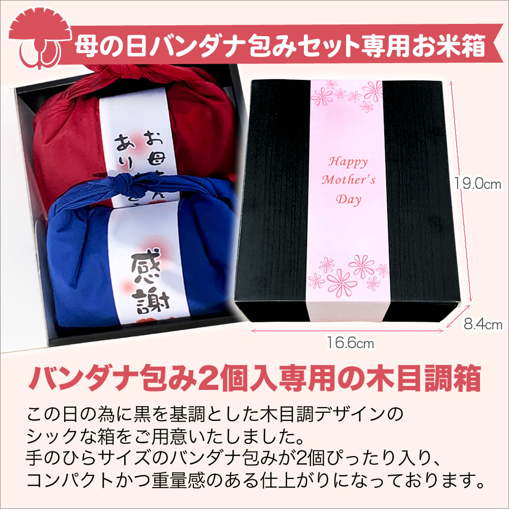 母の日用の、魚沼産コシヒカリ バンダナ包みセット。母の日の感謝の言葉をプリントしたラベルデザインのバンダナ包み2個を、すてきな木目調お米箱にお入れしてお届け致します。
