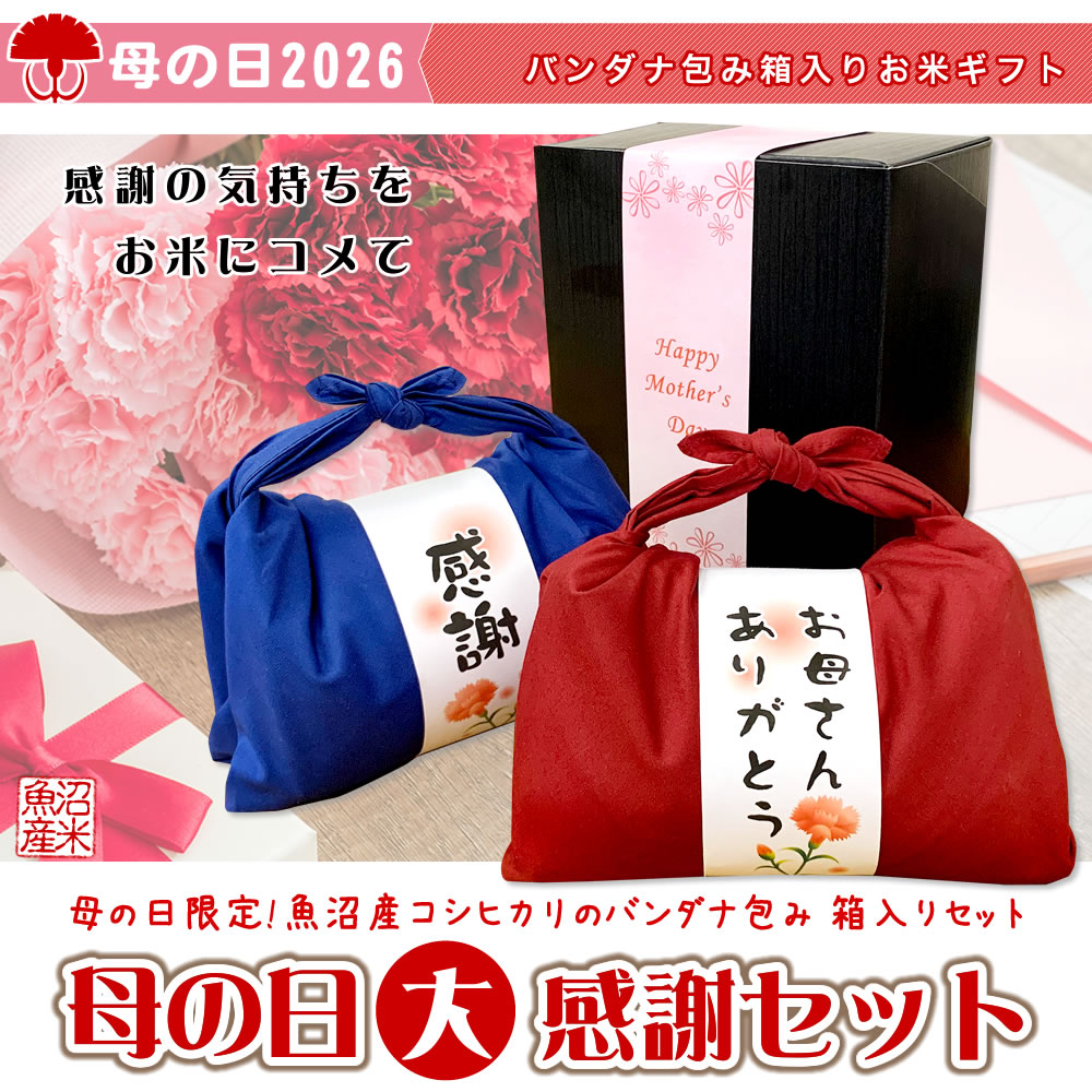 | 製品名 | 【母の日ギフト】大感謝セット 令和7年産 魚沼産コシヒカリ 木目調お米箱入り バンダナ包みセット |