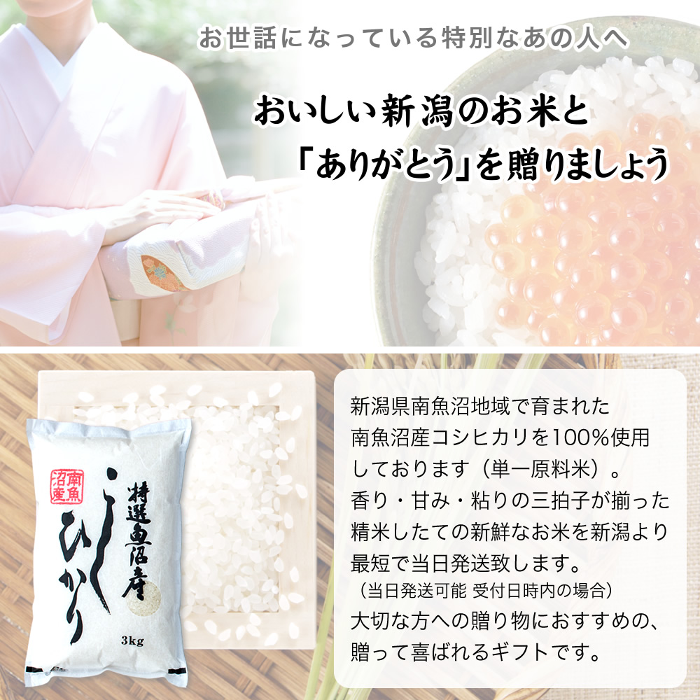 | 商品名 | 【風呂敷包みギフト】新潟県南魚沼産コシヒカリ 3kg |